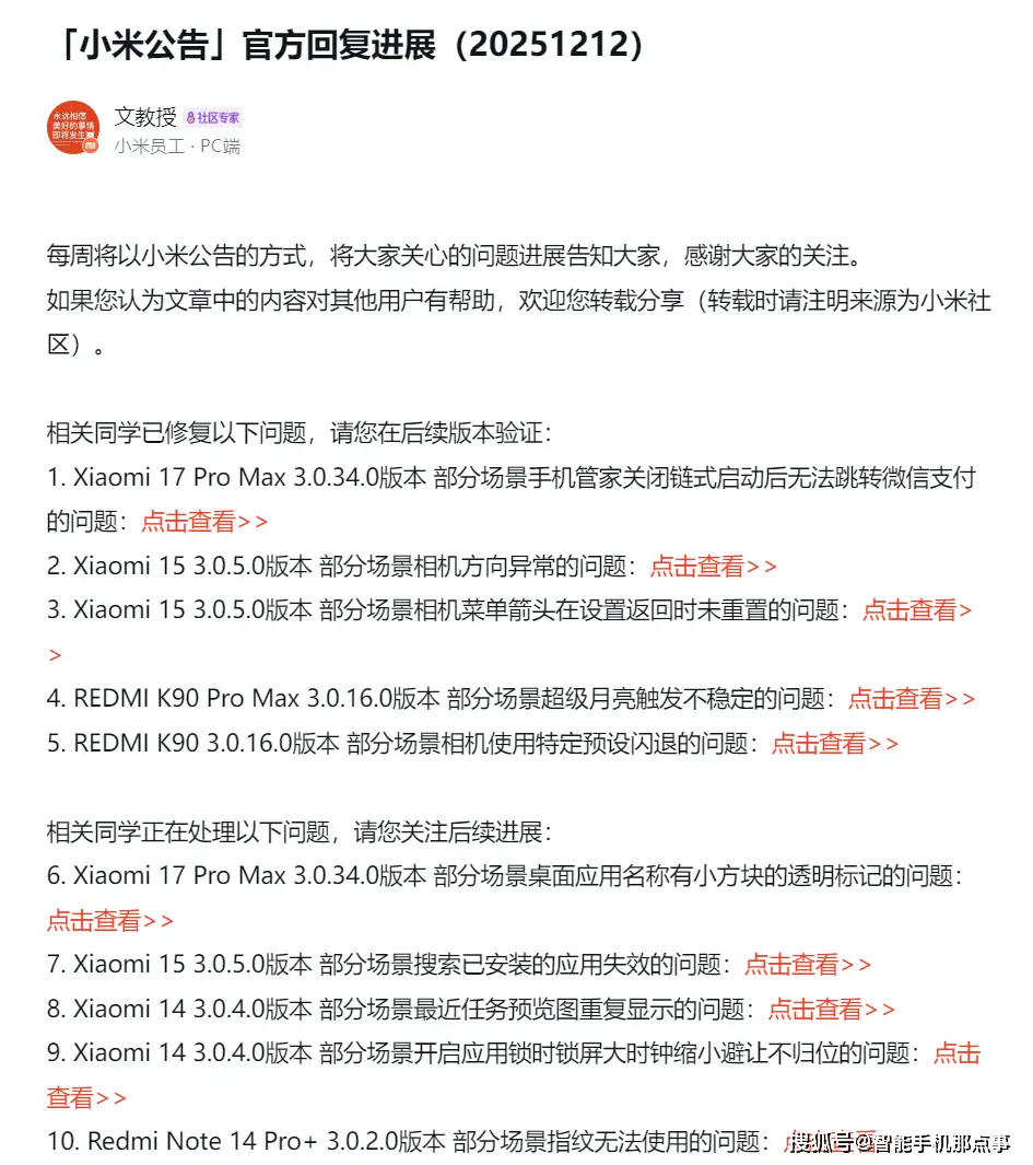 说到这里,与问题修复同步推进的是澎湃OS 3正式版覆盖范围的扩大,根据 小米 官方的公告,从12月10日起,新一批机型的灰度推送已经启动。