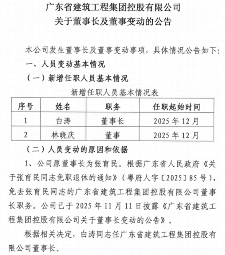 乐居财经赵盼盼近日,广东省建筑工程集团控股有限公司(以下简称“广东建工控股”)公告,白涛正式出任公司董事长。目前,公司官网已更新。