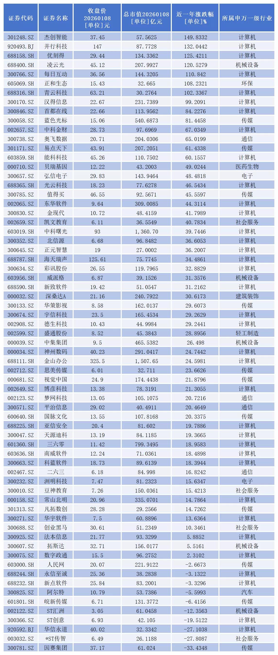 从二级市场表现看,截至1月8日收盘,近一年,已诞生杰创智能(301248.SZ)、并行科技(920493.BJ)、优刻得(688158.SH)、凌云光(688400.SH)、每日互动(300766.SZ)、正和生态(605069.SH)、青云科技(688316.SH)等7只翻倍股。