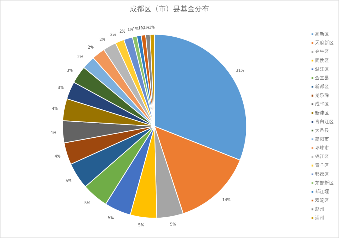 区级基金目前已经覆盖到22个区(市)县,诸如高新区的策源资本、国生资本、成都高科,武侯区的武发私募基金,温江区的光华梧桐基金等,在区域创投生态方面发挥巨大作用。