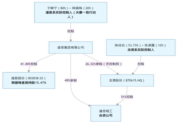 道恩精工作为其控股子公司,是违规事项的直接执行主体;道恩集团则是龙港股份第二大股东,也是上市公司道恩股份(002838)的控股股东,同时也是道恩精工的关联方,此次1.268亿元交易正是基于“股东——子公司”的关联身份触发监管认定。