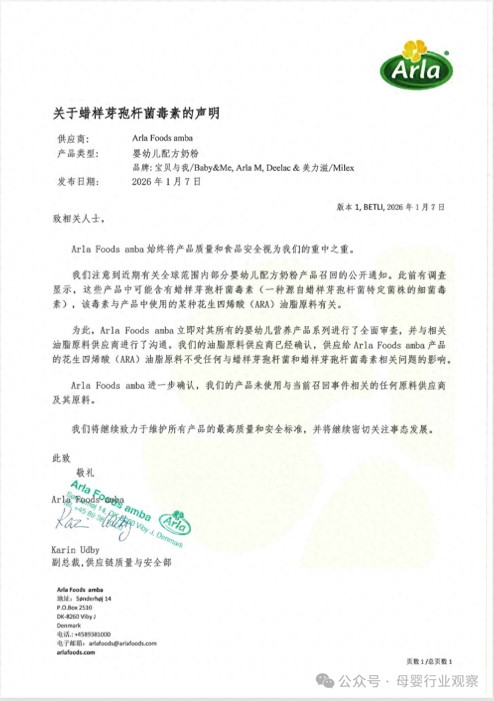 Arla表示,全线产品均未和此次事件中的供应商合作,也不涉及其相关的原料;Arla全线产品使用的ARA油脂原料不受蜡样芽孢杆菌及相关毒素影响,无任何原料问题。