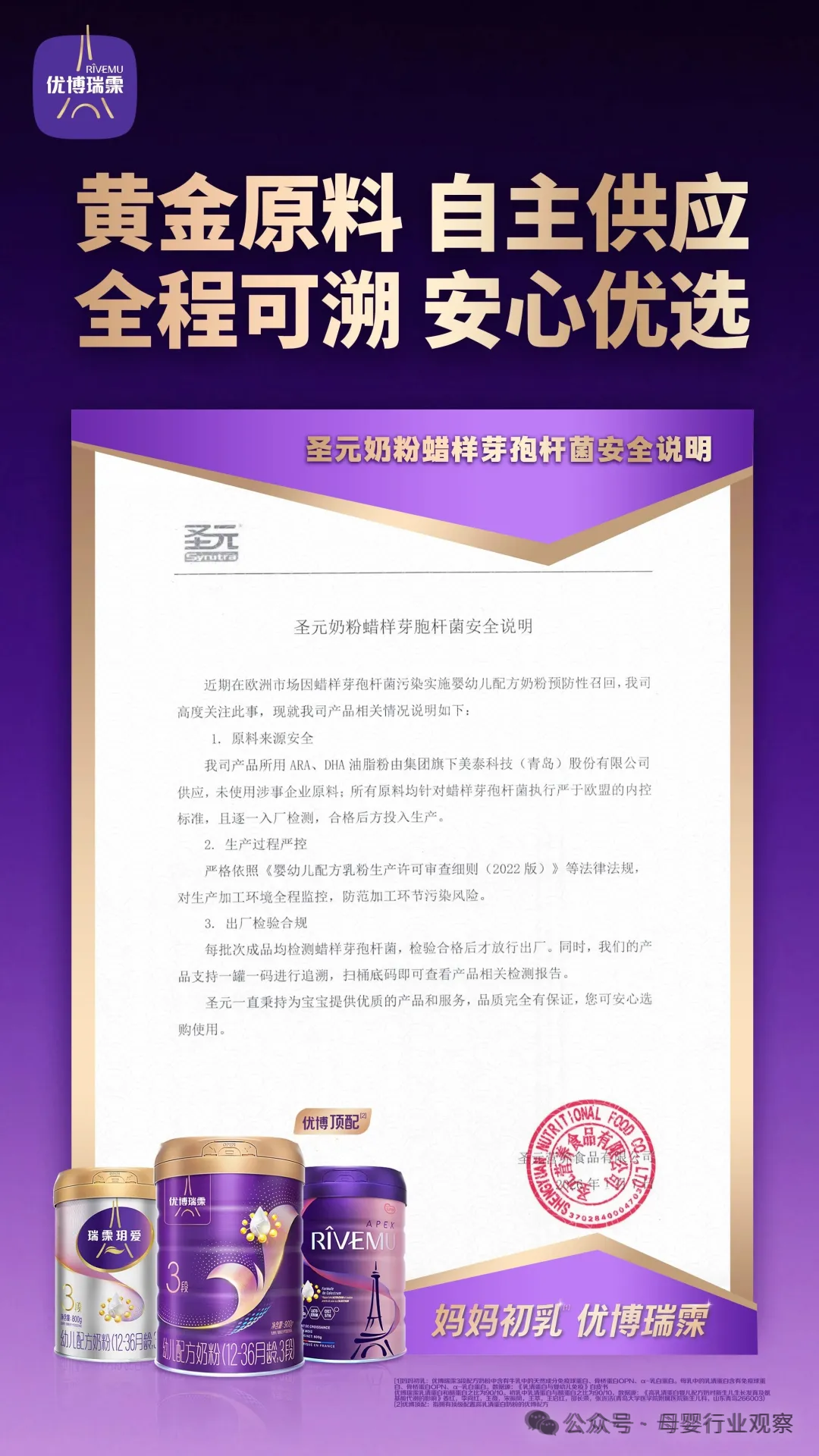 优博瑞霂(圣元旗下)表示,优博瑞霂产品所用ARA油脂粉由圣元国际旗下美泰科技(青岛)股份有限公司供应,原料逐一入厂检测合格后方投入生产,每批次成品均检测蜡样芽孢杆菌,检验合格后才放行出厂。