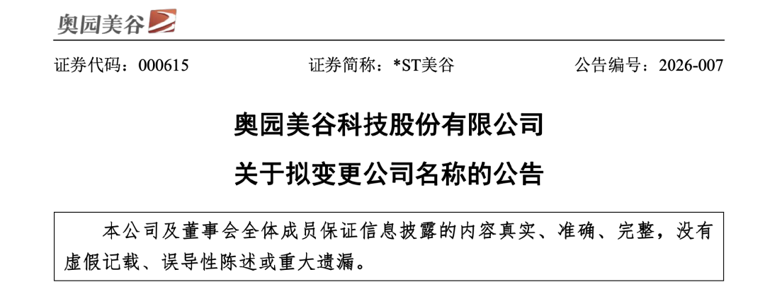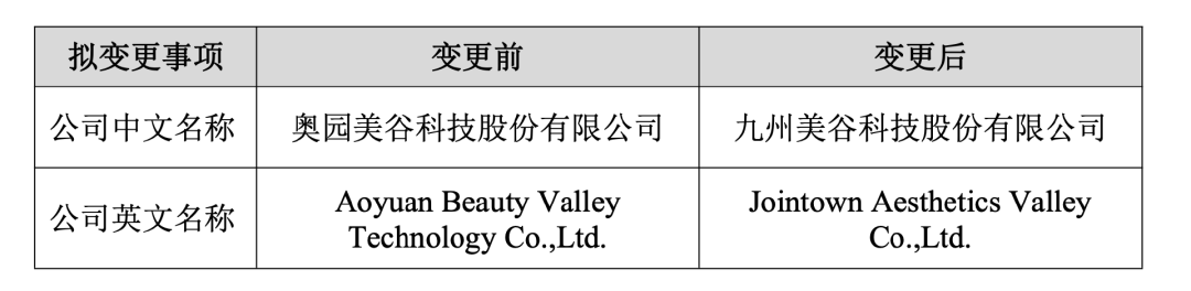 1月9日,*ST美谷发布公告称,拟将公司全称由“奥园美谷科技股份有限公司”变更为“九州美谷科技股份有限公司”,英文全称对应同步变更为“Jointown Aesthetics Valley Co.,Ltd.”。