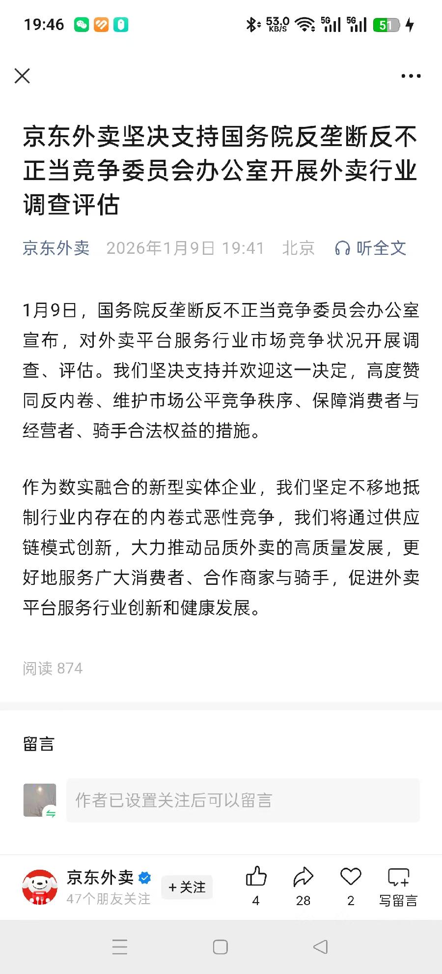 京东外卖坚决支持国务院反垄断反不正当竞争委员会办公室开展外卖行业调查评估