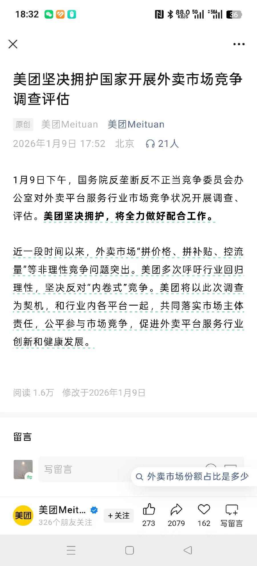 美团通过官微回应表示,“美团坚决拥护,将全力做好配合工作。”美团还表示,近一段时间以来,外卖市场"拼价格、拼补贴、控流量"等非理性竞争问题突出。美团多次呼吁行业回归理性,坚决反对"内卷式"竞争。美团将以此次调查为契机,和行业内各平台一起,共同落实市场主体责任,公平参与市场竞争,促进外卖平台服务行业创新和健康发展。