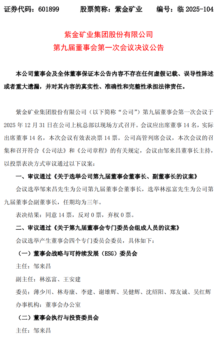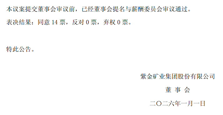 上交所主板上市公司紫金矿业(601899.SH)于2026年1月1日发布了《第九届董事会第一次会议决议公告》。公告显示,公司审议通过《关于聘任公司常务副总裁、副总裁、财务总监及联席财务总监、总工程师的议案》。该公司原财务总监吴红辉升任副总裁兼任财务总监职位。董事会同意聘任蔡雪琳女士为公司联席财务总监。