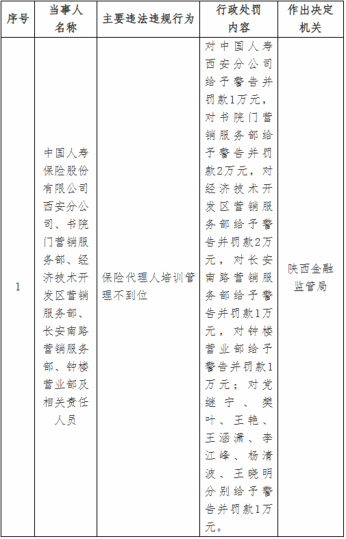 陕西监管局对中国人寿西安分公司给予警告并罚款1万元,对书院门营销服务部给予警告并罚款2万元,对经济技术开发区营销服务部给予警告并罚款2万元,对长安南路营销服务部给予警告并罚款1万元,对钟楼营业部给予警告并罚款1万元。对相关责任人党继宁、樊叶、王艳、王涵潇、李江峰、杨清波、王晓明分别给予警告并罚款1万元。