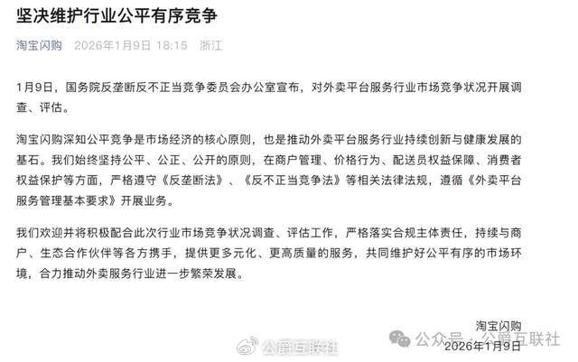 昨天还在高喊要拿“第一”的淘宝闪购,今天就迎面撞上了监管红线。1月9日,国务院反垄断反不正当竞争委员会办公室宣布,对外卖平台服务行业启动调查评估,核心直指“反内卷、反非理性竞争”。