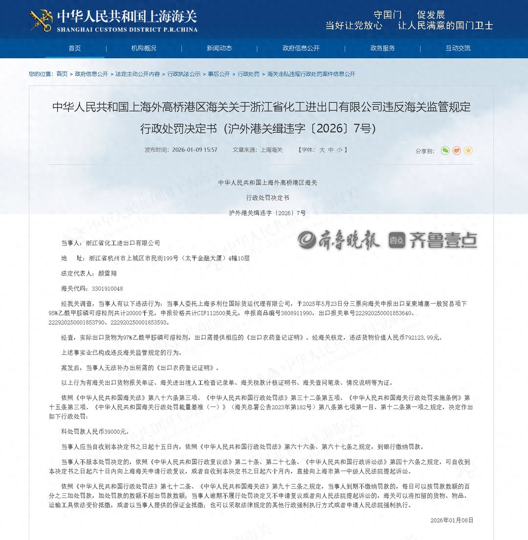 近日,中华人民共和国上海外高桥港区海关发布关于浙江省化工进出口有限公司违反海关监管规定行政处罚决定书(沪外港关缉违字〔2026〕7号)。