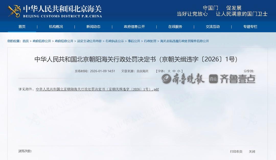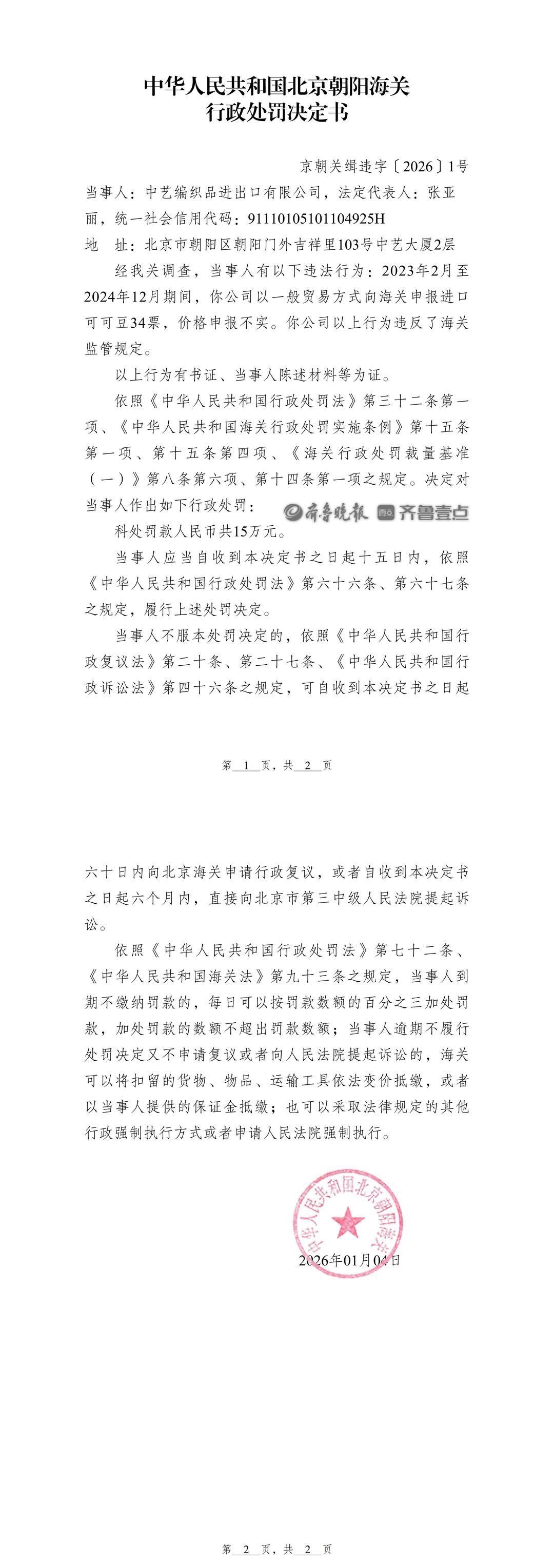 近日,中华人民共和国北京朝阳海关发布行政处罚决定书(京朝关缉违字〔2026〕1号)。中艺编织品进出口有限公司因违反海关监管规定被行政处罚。
