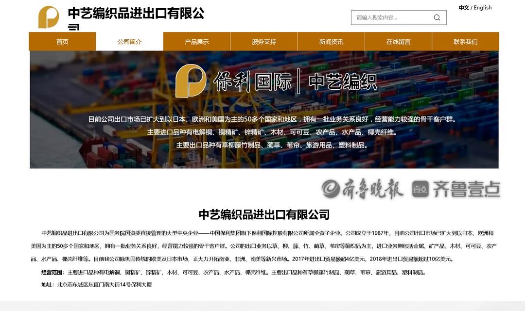 中艺编织品进出口有限公司为国务院国资委直接管理的大型中央企业——中国保利集团旗下保利国际控股有限公司所属全资子企业。公司成立于1987年,目前公司出口市场已扩大到以日本、欧洲和美国为主的50多个国家和地区。公司的出口业务以草、柳、藤、竹、蔺草、苇帘等编织品为主,进口业务则包括金属、矿产品、木材、可可豆、农产品、水产品、椰壳纤维等。