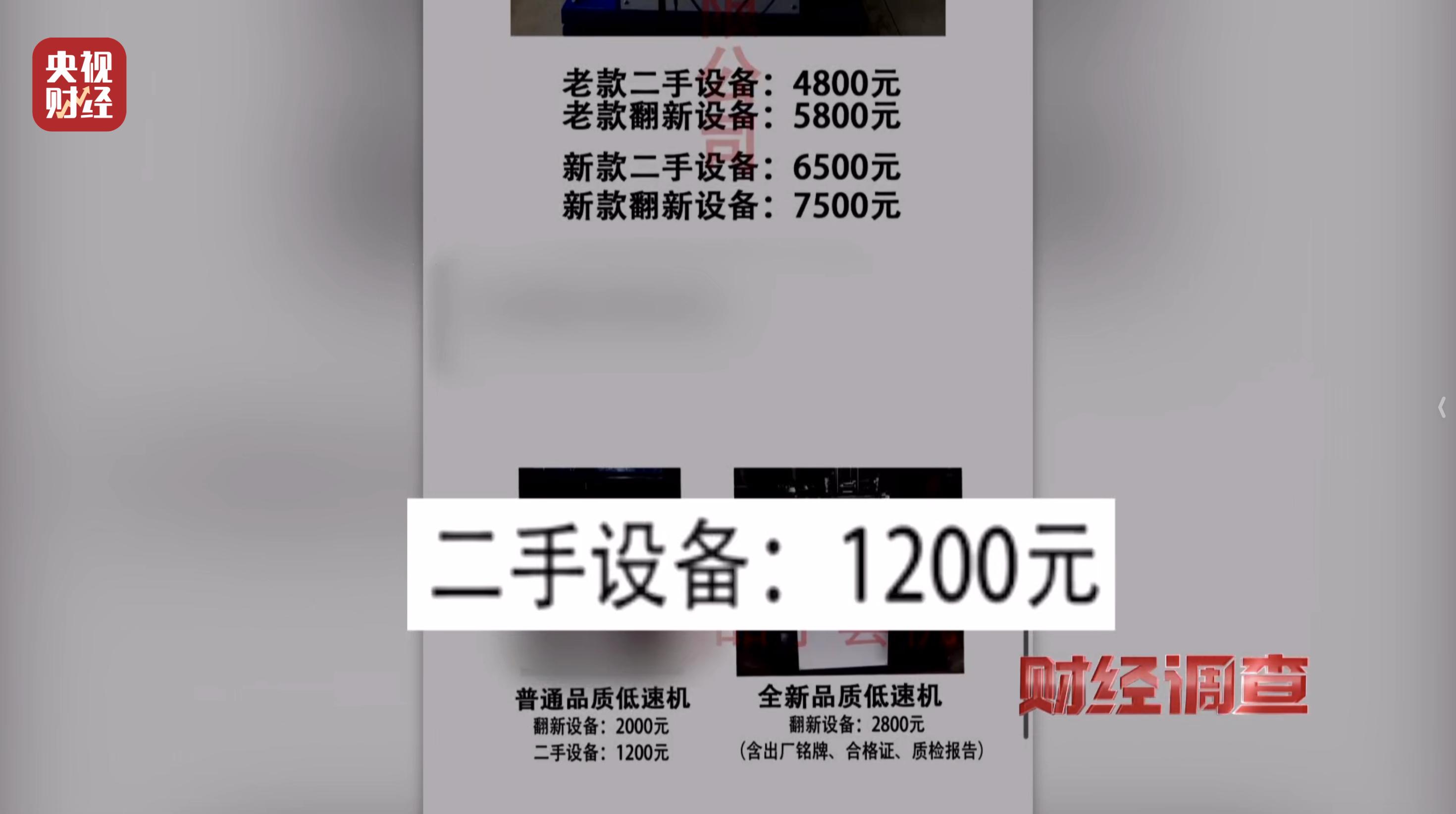 记者以采购设备为由联系到一家手套机厂家,对方发来的报价单显示,手套机分全新、翻新、二手三档,二手翻新机最低仅1200元。