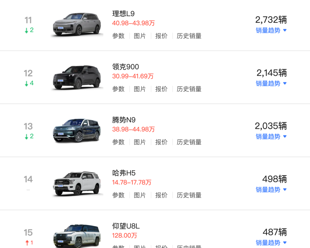 至于乐道L90,其是乐道汽车在2025年推出的重磅车型,在上市初期销量连续稳定在万辆以上,但随着更多竞争力强劲的大型SUV产品出现,乐道L90也扛不住,2025年12月销量4105辆,大致与乐道L60一样的表现,后面能否再次崛起还不得而知。领克900也是领克汽车在2025年推出的重磅车型,是首款大型SUV,销量始终未能突破万辆,2025年12月仅2145辆。此外,理想L9为2732辆,深蓝S09为375辆。