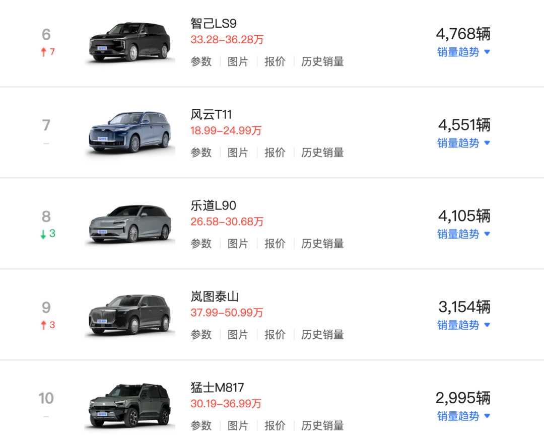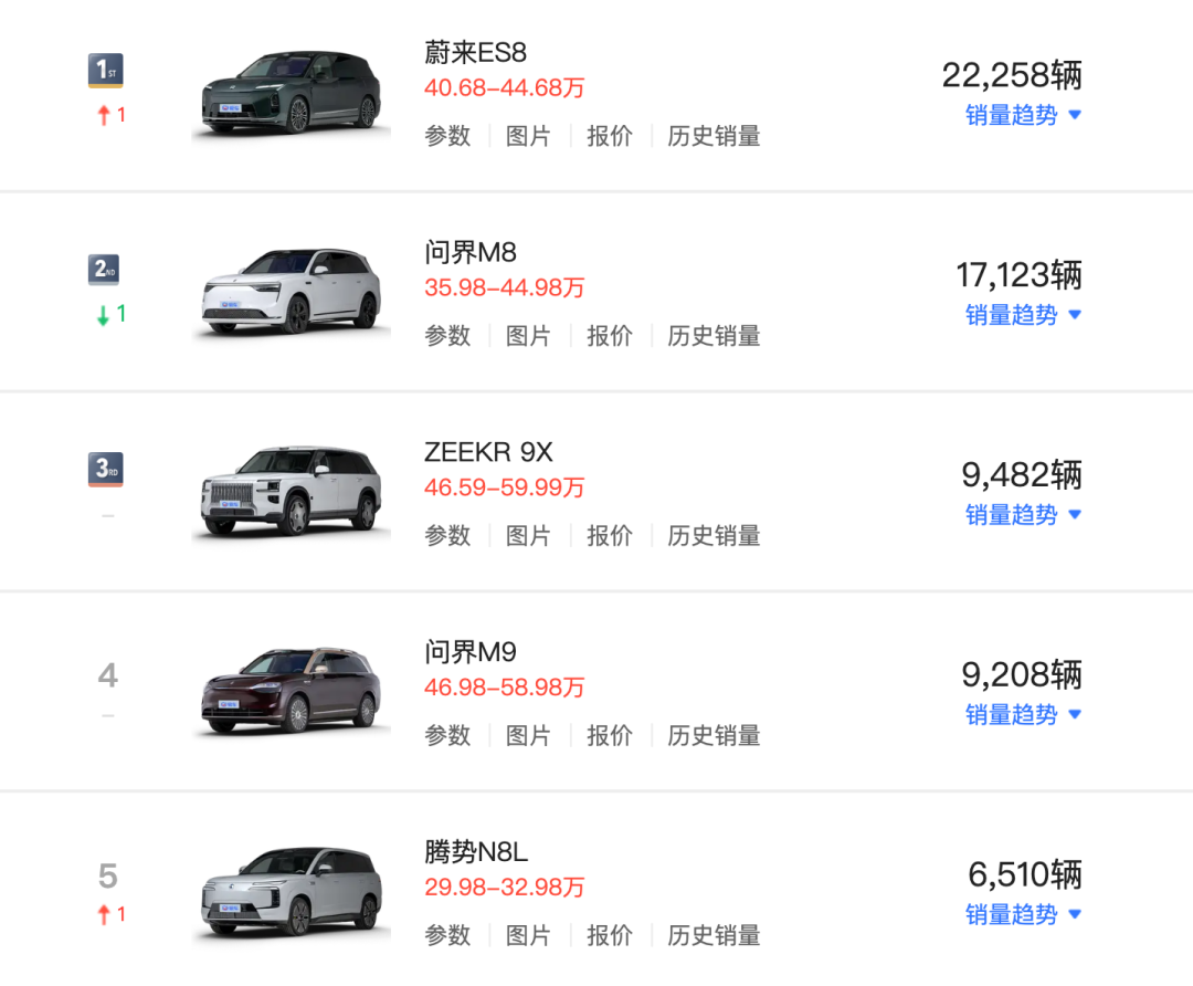 与极氪8X-极氪9X的产品定位类似,腾势N8L于2025年10月上市,与腾势N9共同征战大型SUV市场,但整体表现不如上述的其它产品,2025年12月腾势N8L销量6510辆,腾势N9为2035辆,加起来万辆都不到,勉强够得到极氪9X。