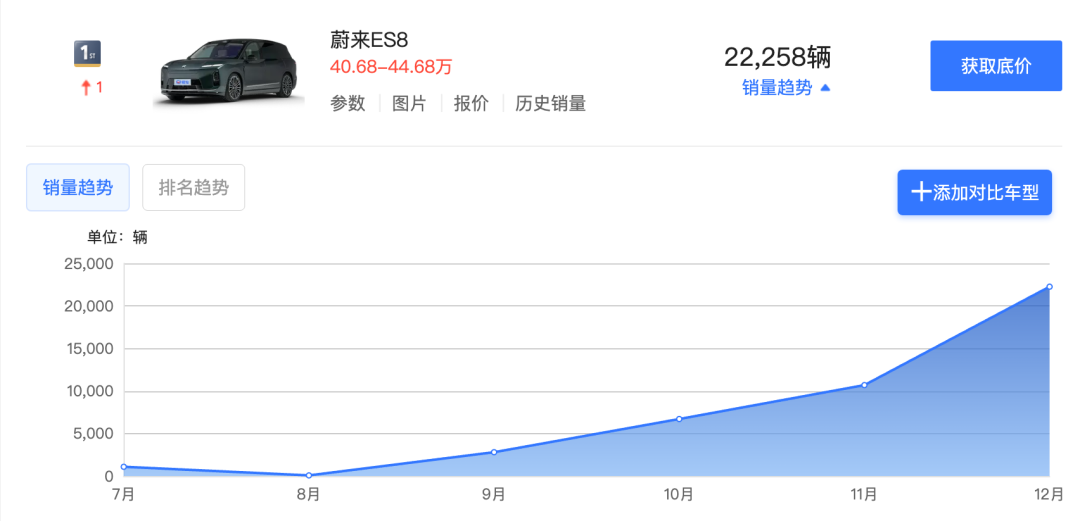 2025年12月大型SUV市场发生“巨变”,连续多月蝉联销冠的问界M8被蔚来ES8反超。据乘联会数据显示,2025年12月销量最高的大型SUV是蔚来ES8,当月销量为22258辆,是唯一一款销量超过2万辆的大型SUV,这也是蔚来ES8上市以来的最高销量表现,占蔚来集团总销量46%。