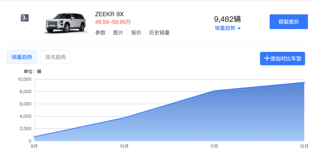 极氪9X于2025年9月上市,售价46.59万元起,是目前极氪旗下尺寸最大的SUV,基于电混专属架构——浩瀚-S(SEA-S)打造,搭载900伏高压混动架构。乘联会数据显示,2025年12月极氪9X销量为9482辆,是上市以来最高销量,后面能否突破万辆,还要走一步看一步。值得一提的是,极氪8X已经官宣,同样是大型SUV,可以看作是缩小版“9X”,上市后将与极氪9X共同征战大型SUV市场。