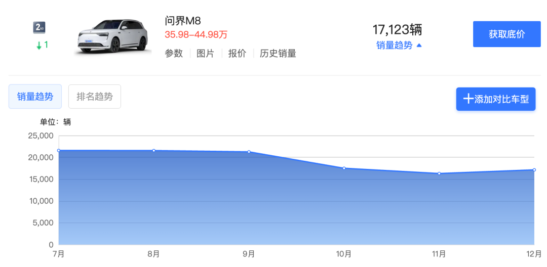 界M8排名第二,是鸿蒙智行旗下畅销车型之一,于2025年4月上市推出增程版,2025年8月推出纯电版,2025年12月销量17123辆,仅次于蔚来ES8,其中纯电车销量7716辆,增程车销量9407辆。从月度表现来看,问界M8近几个月都未能超过2万,同样凸显大型SUV市场竞争的压力。另一款大型SUV——问界M9排名第四,销量为9208辆,其中纯电动1034辆,增程车8174辆,月销量基本稳定在1万辆左右。