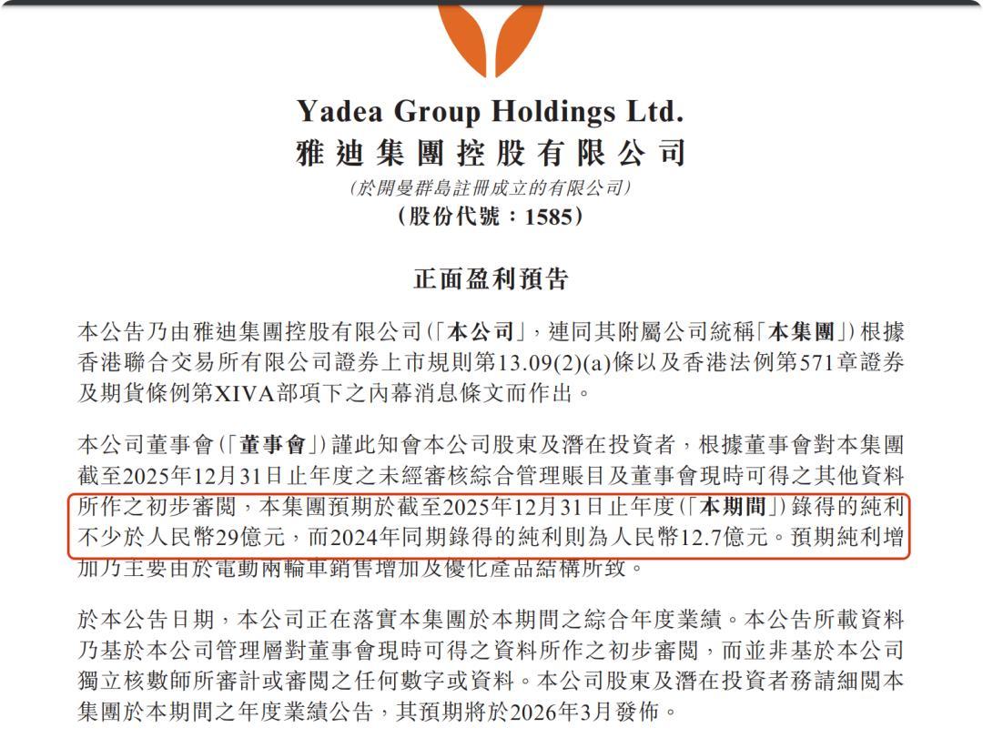 1月6日,雅迪控股(01585.HK,以下简称雅迪)发布正面盈利预告,公告称雅迪2025年净利润不少于29亿元,相比2024年的12.7亿元增幅超过128%,高于市场预期。发盈喜后雅迪高开逾3%,最终以11.74港元收盘,涨幅4.63%。