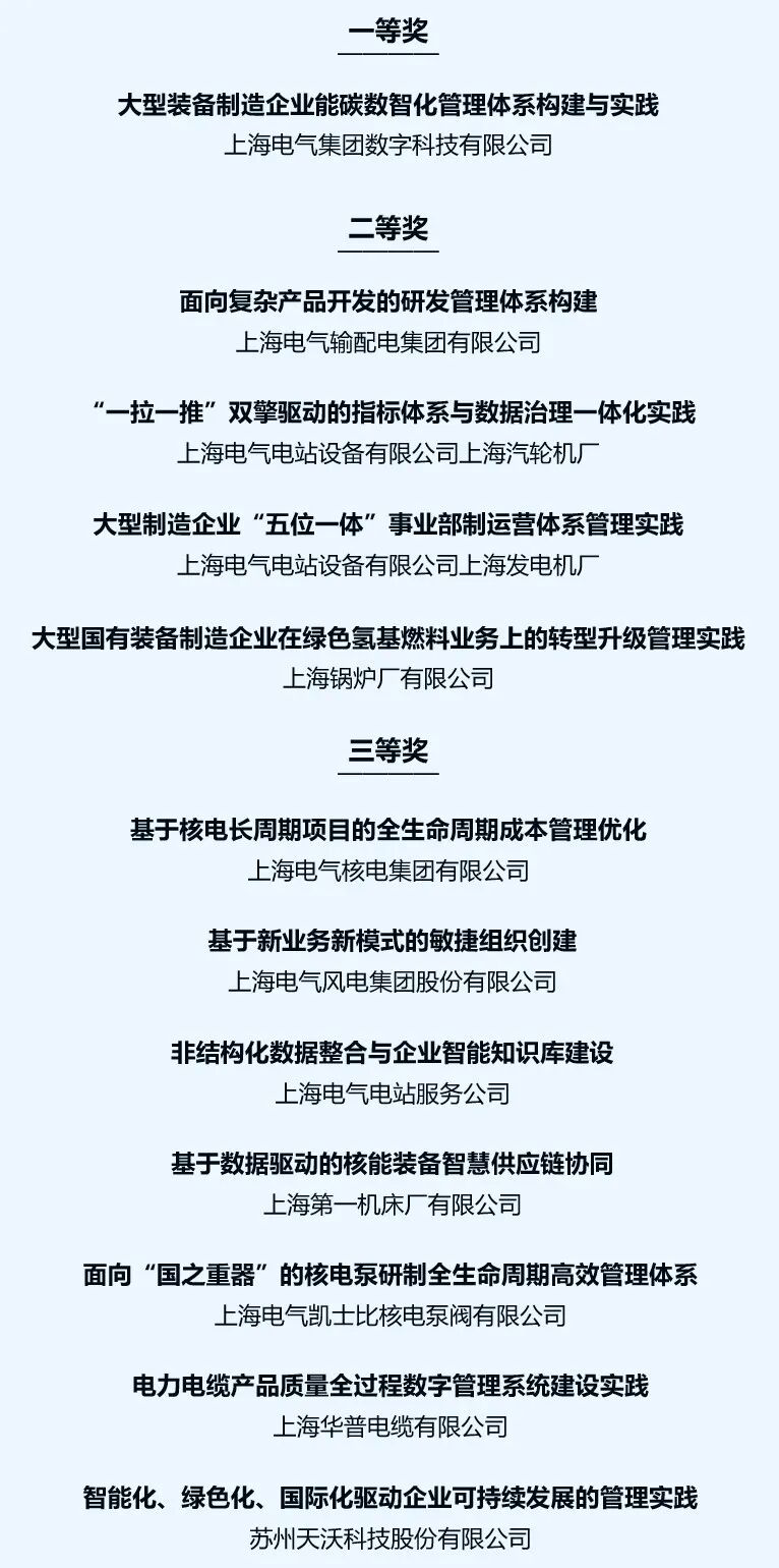 《2025年上海市企业管理现代化创新成果名单》日前揭晓,上海电气旗下多家企业成功入围,其中上海电气集团数字科技有限公司的“大型装备制造企业能碳数智化管理体系构建与实践”荣获一等奖,另有11家企业分获二、三等奖,展现了上海电气近年来依托数智化转型工作,赋能企业生产经营管理提质增效的进步成效应。