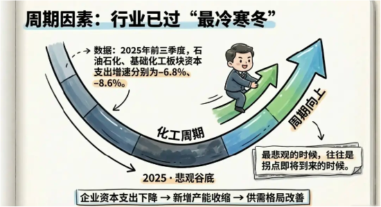 但2025年开始,周期触底的信号越来越明显。根据公开数据,2025年前三季度,石油石化、基础化工板块的资本支出增速分别为-6.8%、-8.6%。