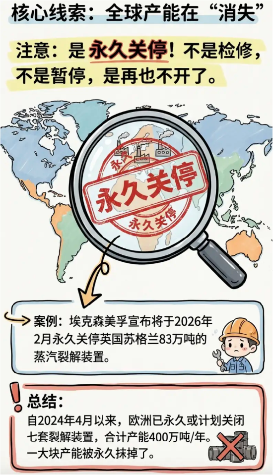 而且这不是孤例。自2024年4月以来,埃克森美孚、壳牌、陶氏等跨国石化企业,已经永久或计划关闭欧洲七套裂解装置,合计产能400万吨/年。