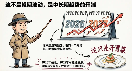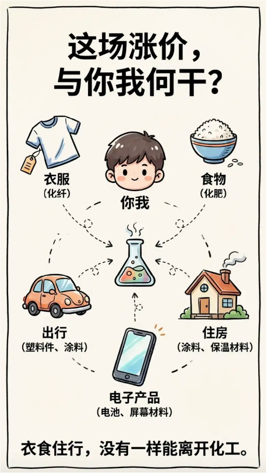 化工涨价,意味着上游成本会逐步向下游传导。虽然传导需要时间,幅度也会被层层消化,但最终会体现在终端产品的价格上。