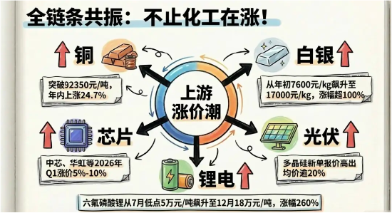往新能源看,光伏和锂电都在涨。多晶硅新单报价较之前市场成交均价高出逾20%。六氟磷酸锂从2025年7月的低点约5万元/吨飙升至12月的18万元/吨,涨幅高达260%。