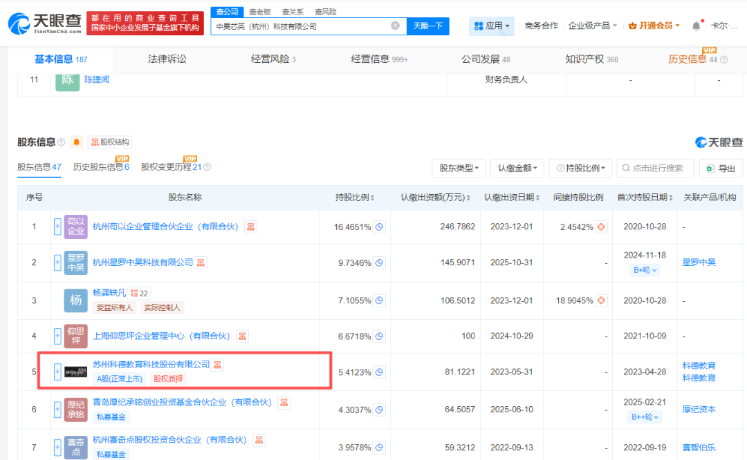 早在2023年,科德教育就以增资及股权转让方式合计出资1.3亿元,参股中昊芯英(杭州)科技有限公司。