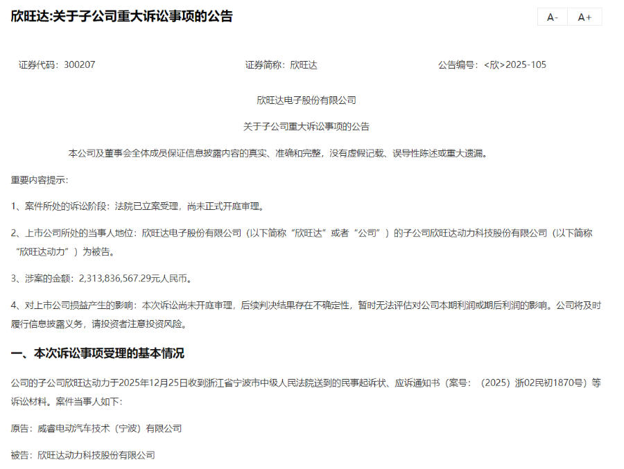 2025年12月26日,欣旺达发布公告称,其子公司欣旺达动力被吉利控股集团旗下的威睿电动汽车技术(宁波)有限公司起诉,索赔金额高达23.14亿元。这起诉讼的起因是2021年6月至2023年12月欣旺达动力交付的电芯存在质量问题。目前,这一案件尚未开庭,后续判决结果存在不确定性。