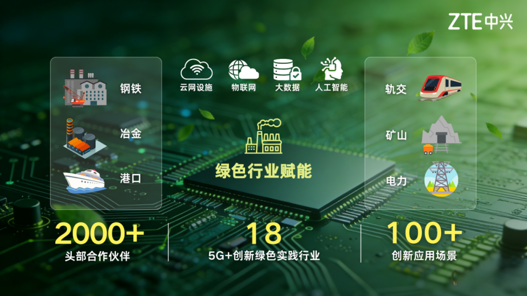 在绿色行业赋能方面,中兴通讯通过云网设施、物联网、大数据、人工智能等一系列先进技术与传统产业结合,实现发展与减排的双赢,已携手2000+个行业头部合作伙伴在钢铁、冶金、电子制造、港口、轨交、矿山、电力等18个行业广泛开展5G+创新绿色实践,打造了100多个创新应用场景。