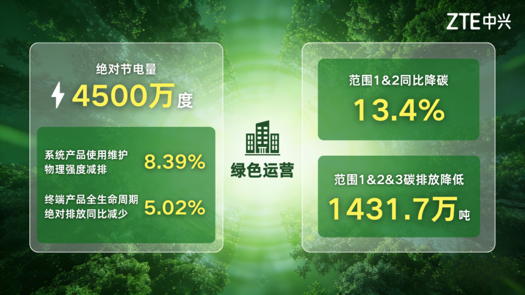 在绿色企业运营方面,2024年中兴通讯实现绝对节电4500万度,同比范围1&2降碳13.4%,系统产品使用维护物理强度减排8.39%;终端产品全生命周期绝对排放同比减少5.02%。对比2023年,中兴通讯范围1&2&3碳排放降低1431.7万吨。