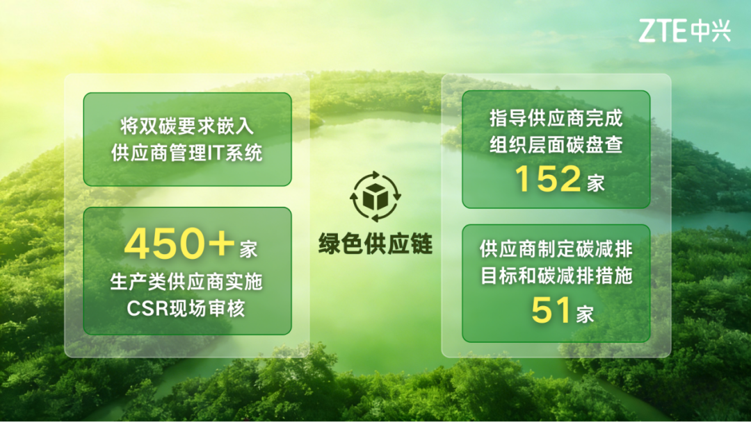 在绿色供应链方面,中兴通讯将双碳要求嵌入供应商协议签署、现场审核、绩效考核等供应商管理IT系统,目前已对450多家生产类供应商实施了CSR现场审核,指导了152家供应商完成组织层面碳盘查,51家供应商制定碳减排目标和碳减排措施。
