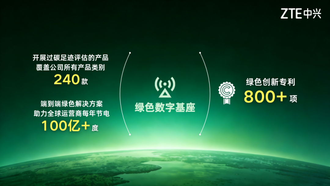 在绿色数字基座方面,中兴通讯绿色创新专利现已达800多项。目前,中兴通讯开展过碳足迹评估的产品数量达到240款,覆盖公司所有产品类别,公司的端到端绿色解决方案持续帮助全球运营商每年节电100亿多度。