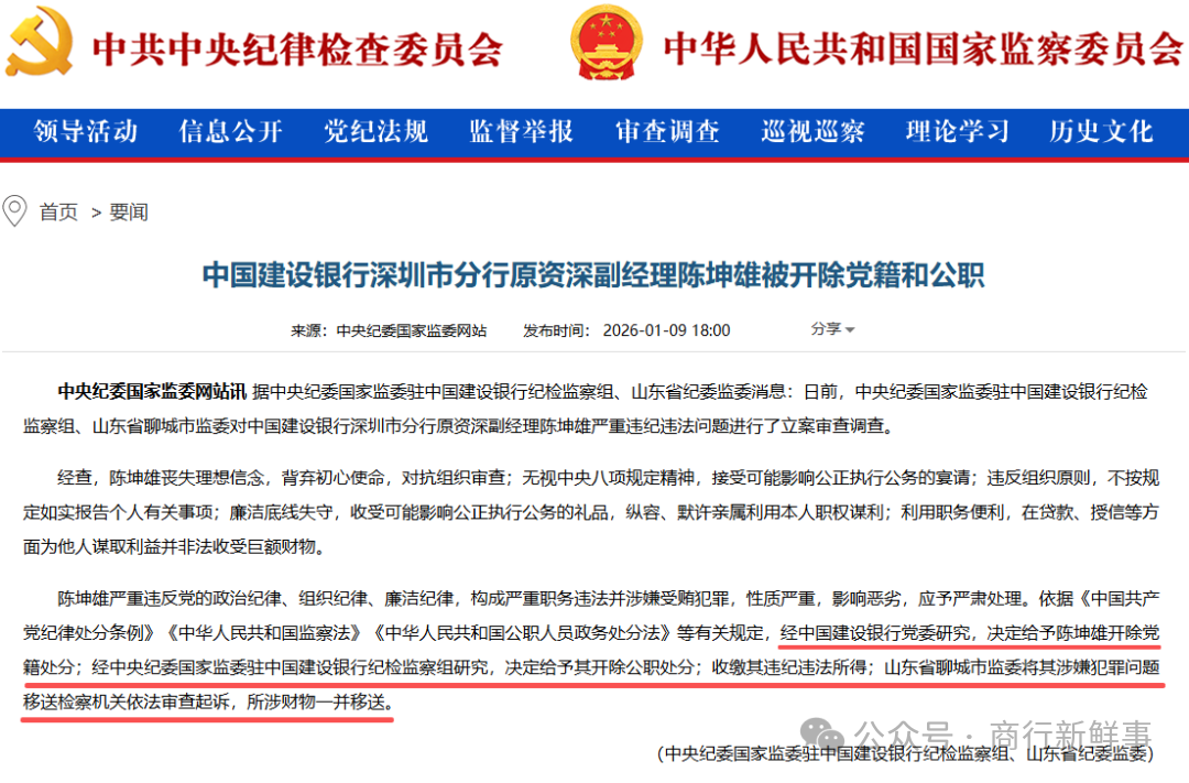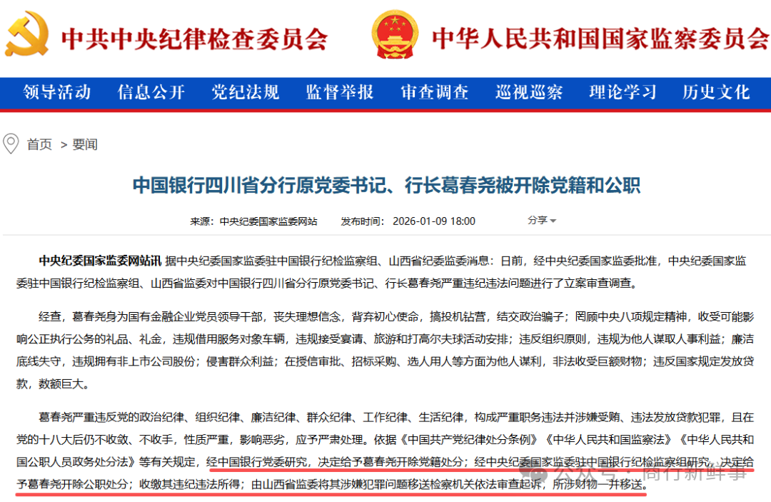 2026年1月9日,中央纪委国家监委网站通报两起金融领域违纪违法案件,中国银行四川省分行原党委书记、行长葛春尧,中国建设银行深圳市分行原资深副经理陈坤雄分别因严重违纪违法被立案审查调查,并受到开除党籍、开除公职处分,涉嫌犯罪问题均被移送检察机关依法审查起诉。