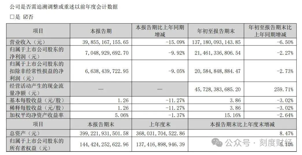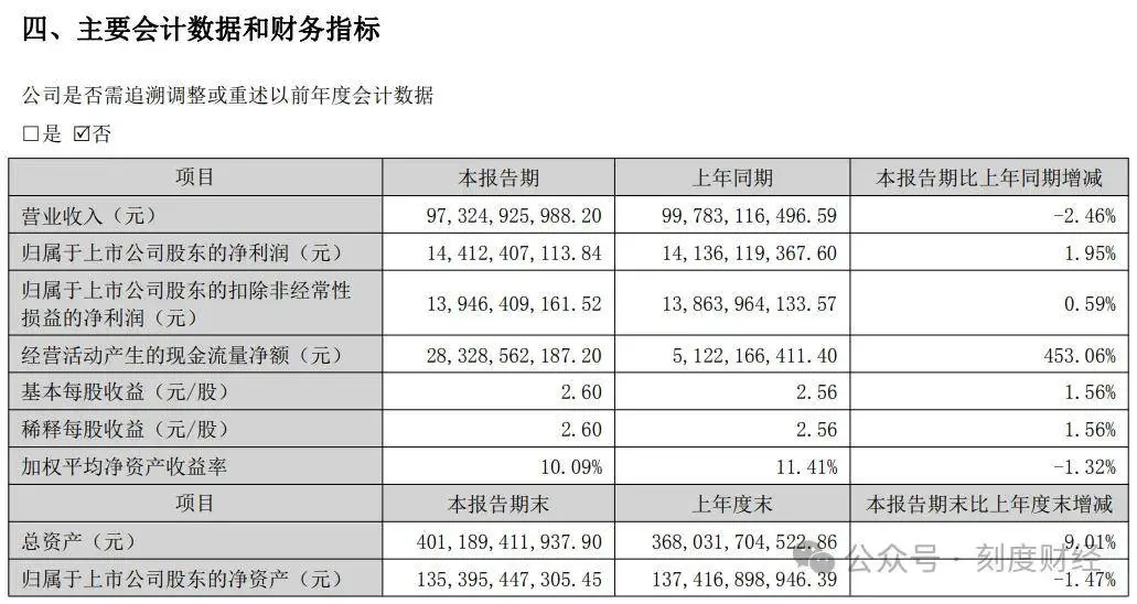 2025年上半年营业收入973.25亿元,同比降2.46%,归母净利润144.12亿元,增速才1.95%。
