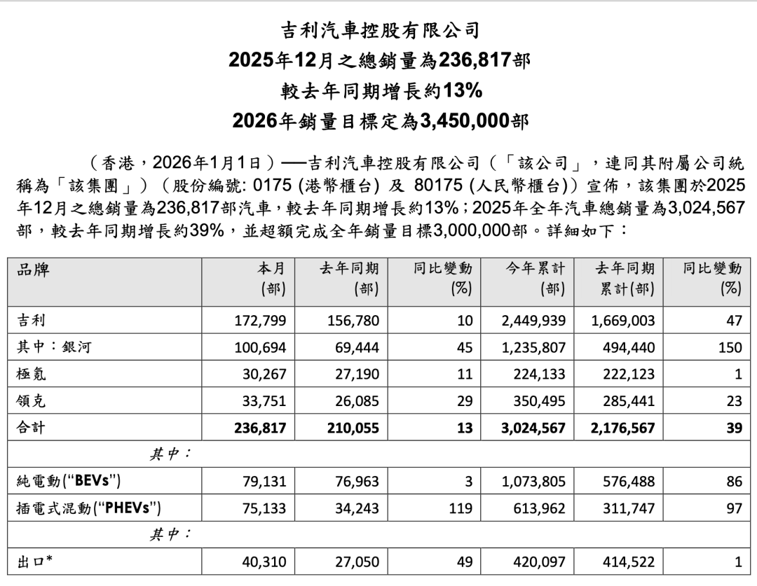 2025年的吉利汽车集团绝对是赢麻了,从2024年的217.6万辆,一跃升至2025年创纪录的302.4万辆,同比增长高达39%,还实现了既定300万辆的目标。具体品牌层面也是全面上涨:吉利、极氪和领克全线增长。