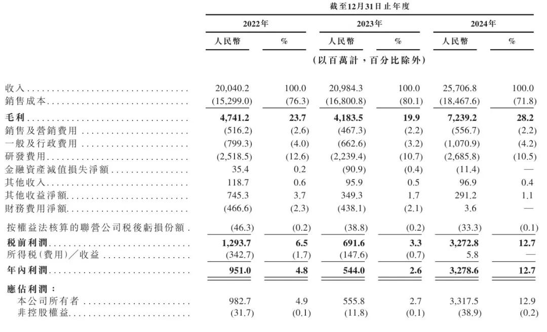 豪威集团2022年、2023年、2024年年内利润分别为9.51亿元、5.44亿元、32.79亿元;年内利润率分别为4.8%、2.6%、12.7%。