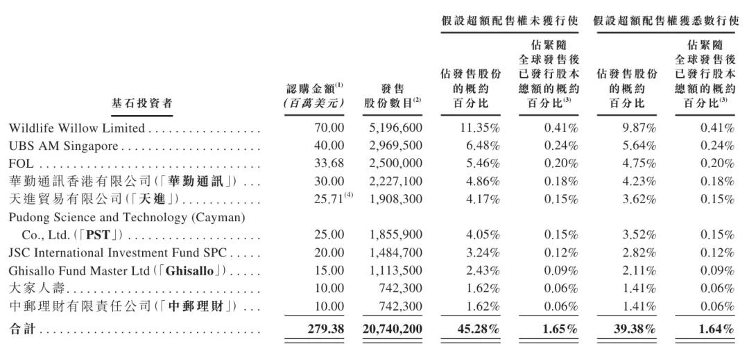 其中,Wildlife Willow认购7000万美元,UBS AM Singapore认购4000万美元,FOL认购3368万美元,华勤通讯认购3000万美元,天进认购2571万美元,PST认购2500万美元,JSC International Investment Fund SPC认购2000万美元,Ghisallo认购1500万美元,大家人寿、中邮理财分别认购1000万美元。