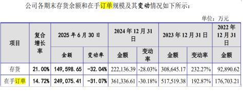 尽管近年来营业收入和净利润持续增长,但公司在手订单却出现下降。报告期各期末,公司在手订单规模分别为17.67亿元、51.75亿元、36.13亿元和24.91亿元,复合增长率为14.72%,与存货增长趋势接近。江松科技在其招股书中解释,受光伏产能加速出清影响,2024年末公司在手订单有所下滑。