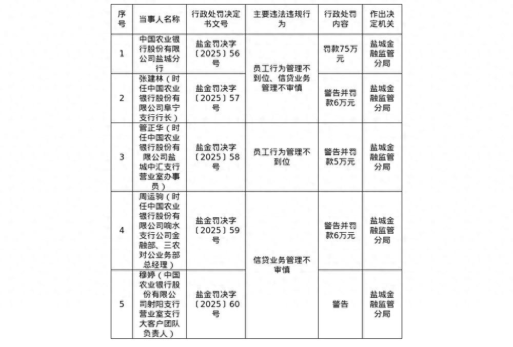 针对上述违法违规行为,国家金融监督管理总局盐城监管分局对其罚款75万元;对张建林(时任中国农业银行股份有限公司阜宁支行行长)警告并处罚款6万元;对管正华(时任中国农业银行股份有限公司盐城中汇支行营业室办事员)警告并处罚款5万元;对周运驹(时任中国农业银行股份有限公司响水支行公司金融部、三农对公业务部总经理)警告并处罚款6万元;对穆婷(中国农业银行股份有限公司射阳支行营业室支行大客户团队负责人)警告。