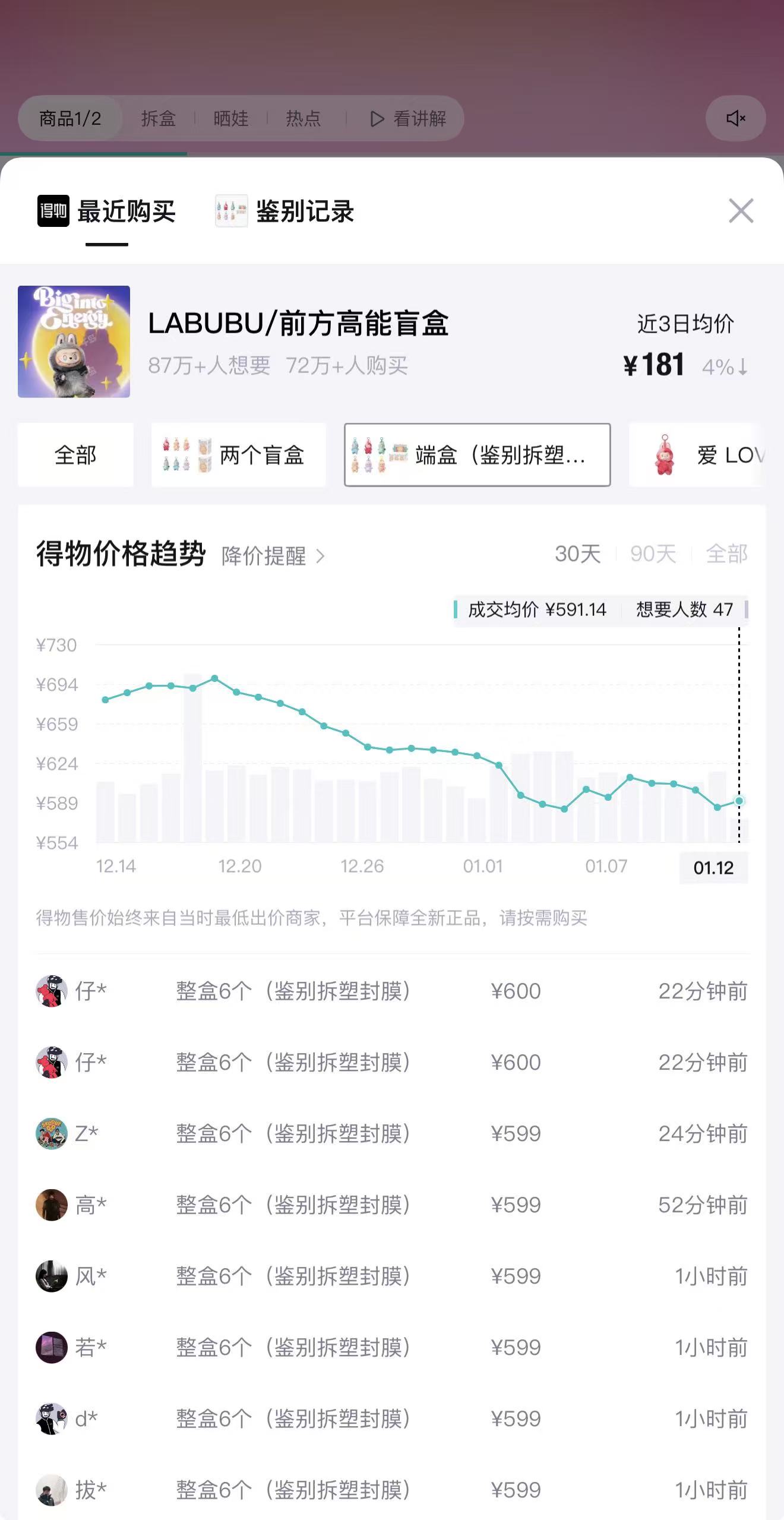 界面新闻从二手交易平台获悉,部分LABUBU 3.0前方高能系列整端6盒的转手价近期有所下滑。1月10日,潮流网购社区得物APP显示,前方高能系列整端6盒售价543元,近3日均价下跌181元;而在去年12月份同款6盒最高价格近700元。星星人美味时刻盲盒的价格也出现下滑,当日成交均价为138元,而在高峰时期其成交均价为359元。