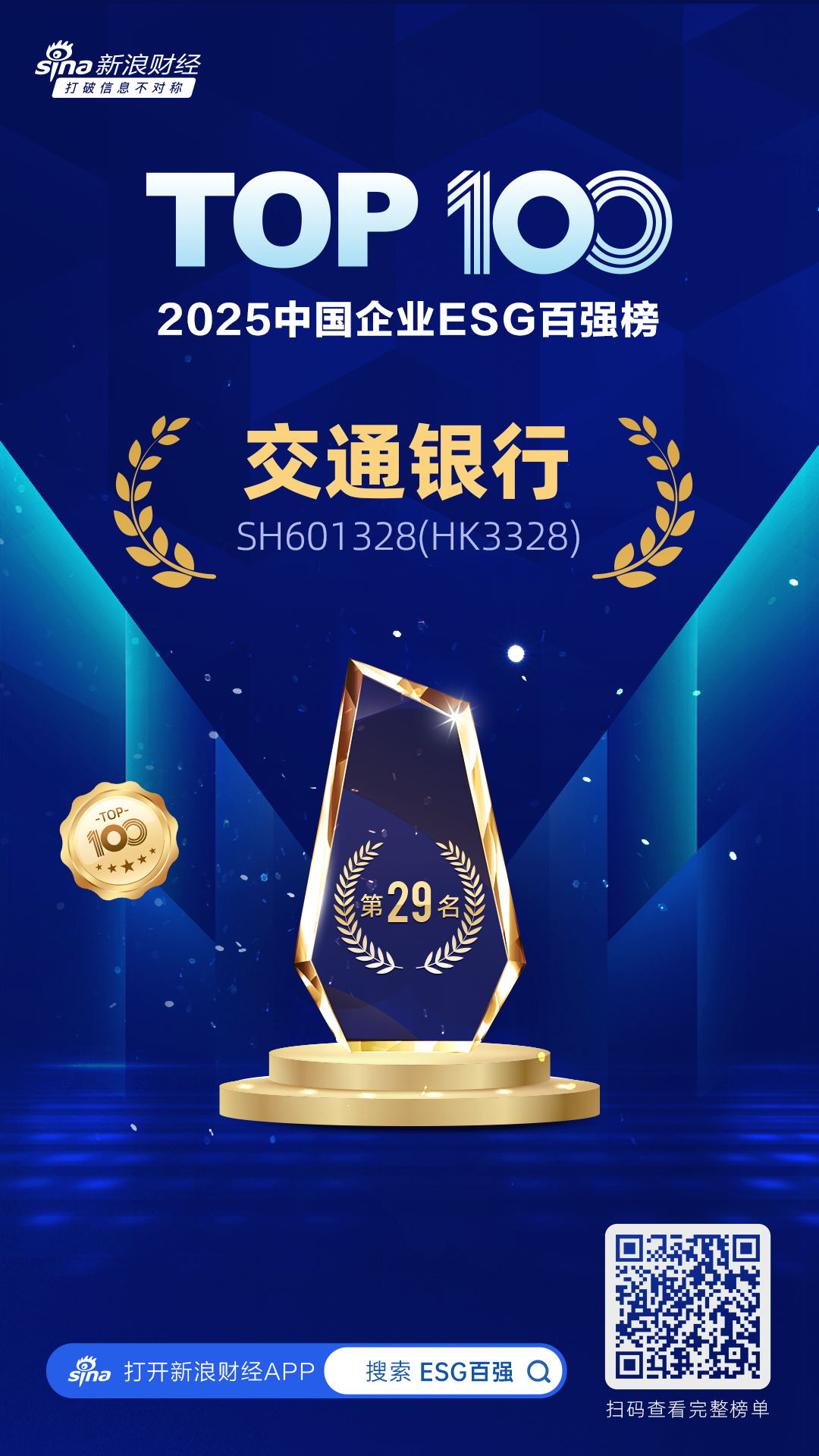 交通银行在环境、社会、公司治理领域开展了大量工作,积累了丰富的创新实践与扎实的落地成果。凭借在ESG各领域的卓越表现,交通银行成功入选本次新浪财经“2025中国企业ESG百强”榜单,并位列第29名。