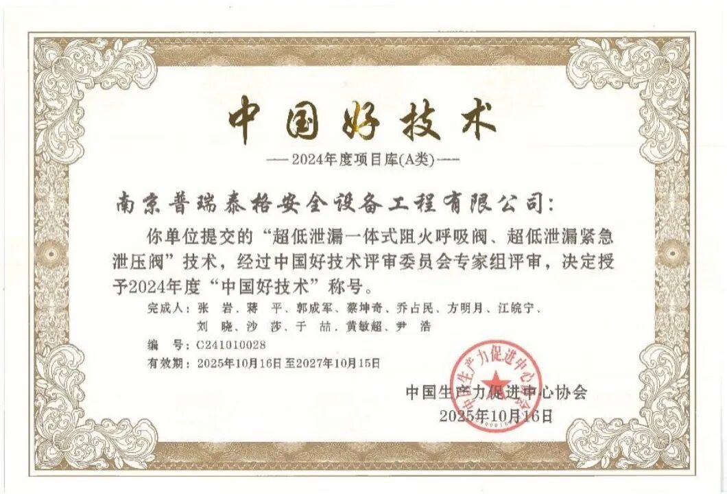 南京普瑞泰格安全设备工程有限公司(以下简称“普瑞泰格”)历经多年创新攻关,自主研发的超低泄漏一体式阻火呼吸阀、超低泄漏紧急泄压阀技术,经中国工业报社推荐,成功入选“中国好技术”名录。这项自主研发的核心技术,从根源上解决了储罐阀门“持续排放、持续泄漏”的行业痛点,更为全球石化储运领域的环保治理贡献了中国方案。