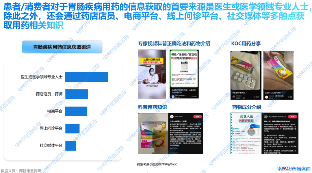 随着主动胃肠健康管理的习惯逐渐融入到生活日常,消费者获取胃肠用药知识的渠道更加多元化,由医生和医学专业人士扩展到电商平台、网上问诊平台和社交媒体。消费者对用药知识需求强烈,品牌可通过短视频、图文等内容形式,联合医生、药师等专业资源,构建“专业指导+场景解决方案”的营销内容体系。