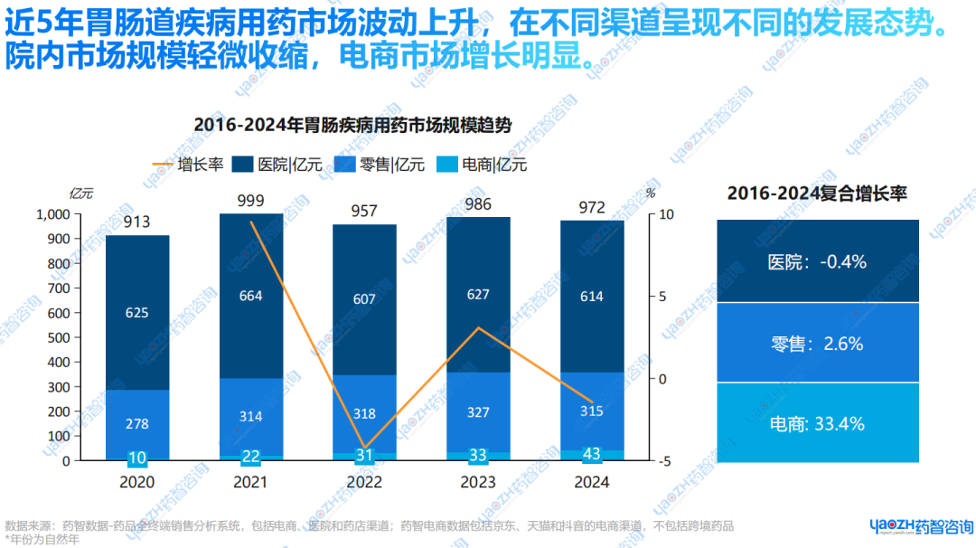 近五年,胃肠疾病用药市场整体呈波动上升趋势,但不同渠道表现差异显著: