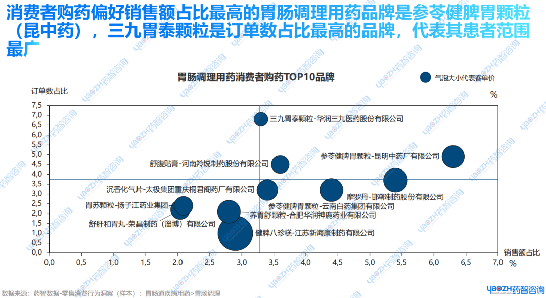 三九胃泰颗粒是胃肠调理类用药订单数占比最高的品牌,而参苓健脾胃颗粒的销售额占比最高,得益于产品更高的客单价。