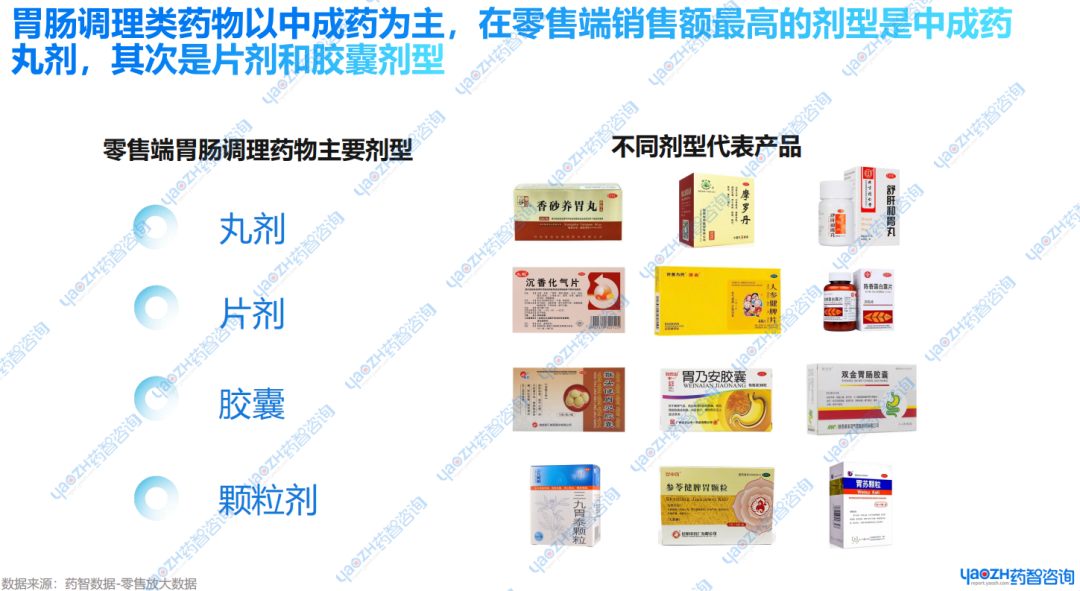 胃肠调理用药以中成药为主,中成药丸剂在患者群体中有悠久的使用习惯,零售端销售额最高的剂型为:丸剂、片剂、胶囊剂、颗粒剂。