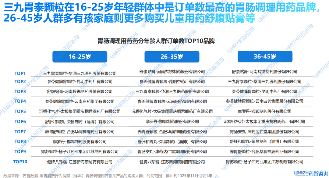 从不同年龄段来看,消费者购买的品牌分布有所差异:16-25岁年轻人购买最多的胃肠调理品牌是三九胃泰颗粒;26-45岁有孩家庭则更多购买儿童用药如舒腹贴膏。