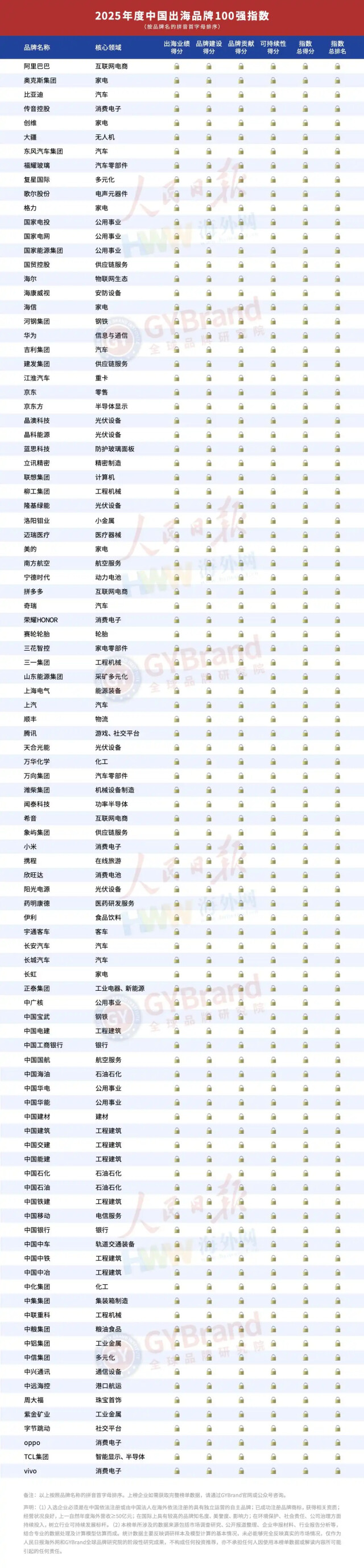 该报告由《人民日报》海外网与GYBrand全球品牌研究院联合编制,是衡量中国企业全球化发展水平的重要风向标。报告主要从公司出海业绩、品牌建设、品牌贡献、可持续发展四大核心维度进行综合评估,评选出海100强企业。上榜企业分布于全国19个地区的40个城市,覆盖20个主要行业,均为海外营收超50亿元的行业龙头,平均海外营收高达1100亿元。
